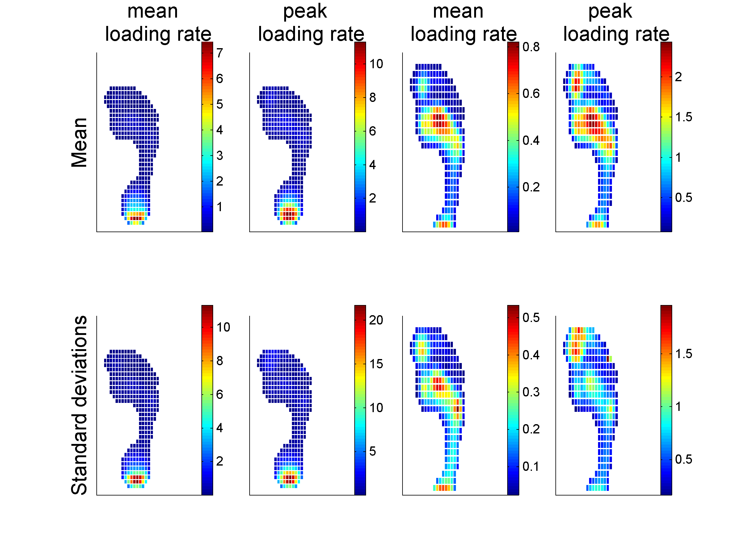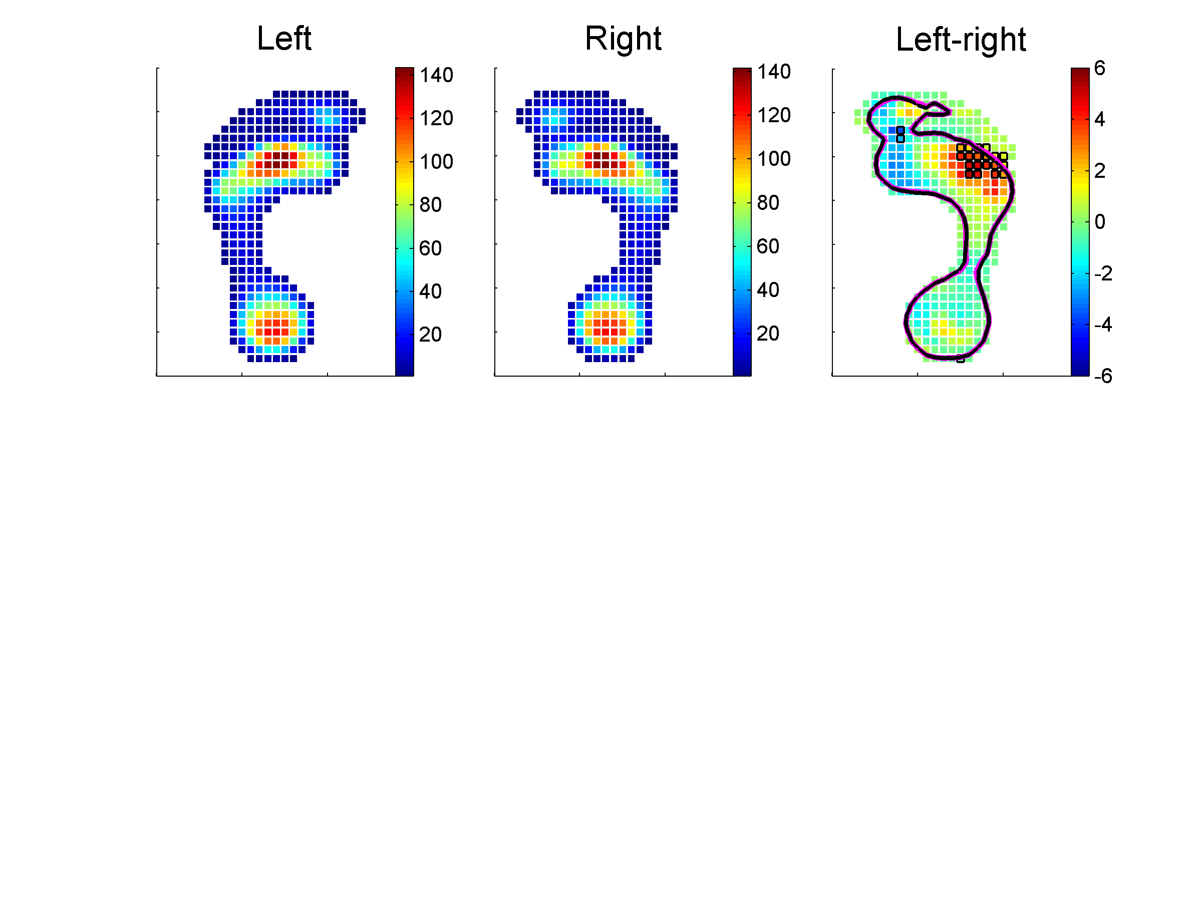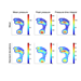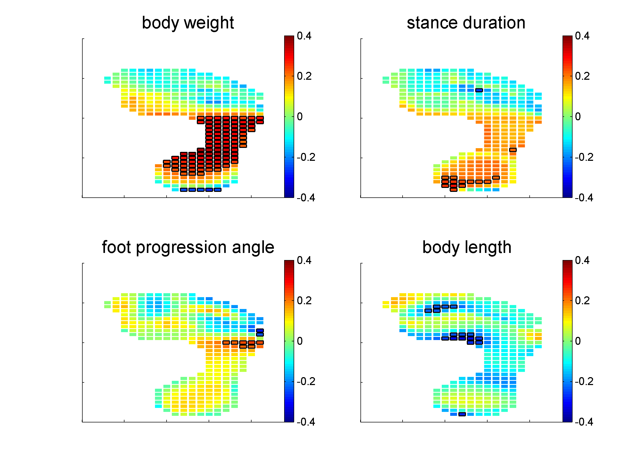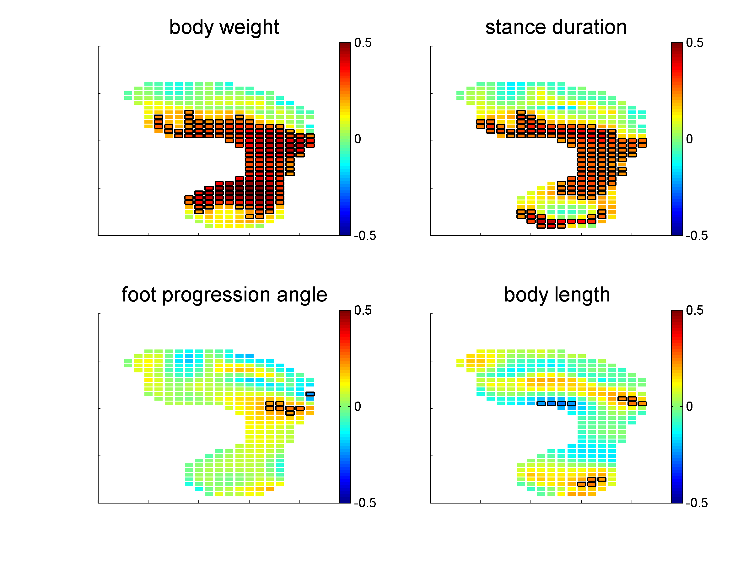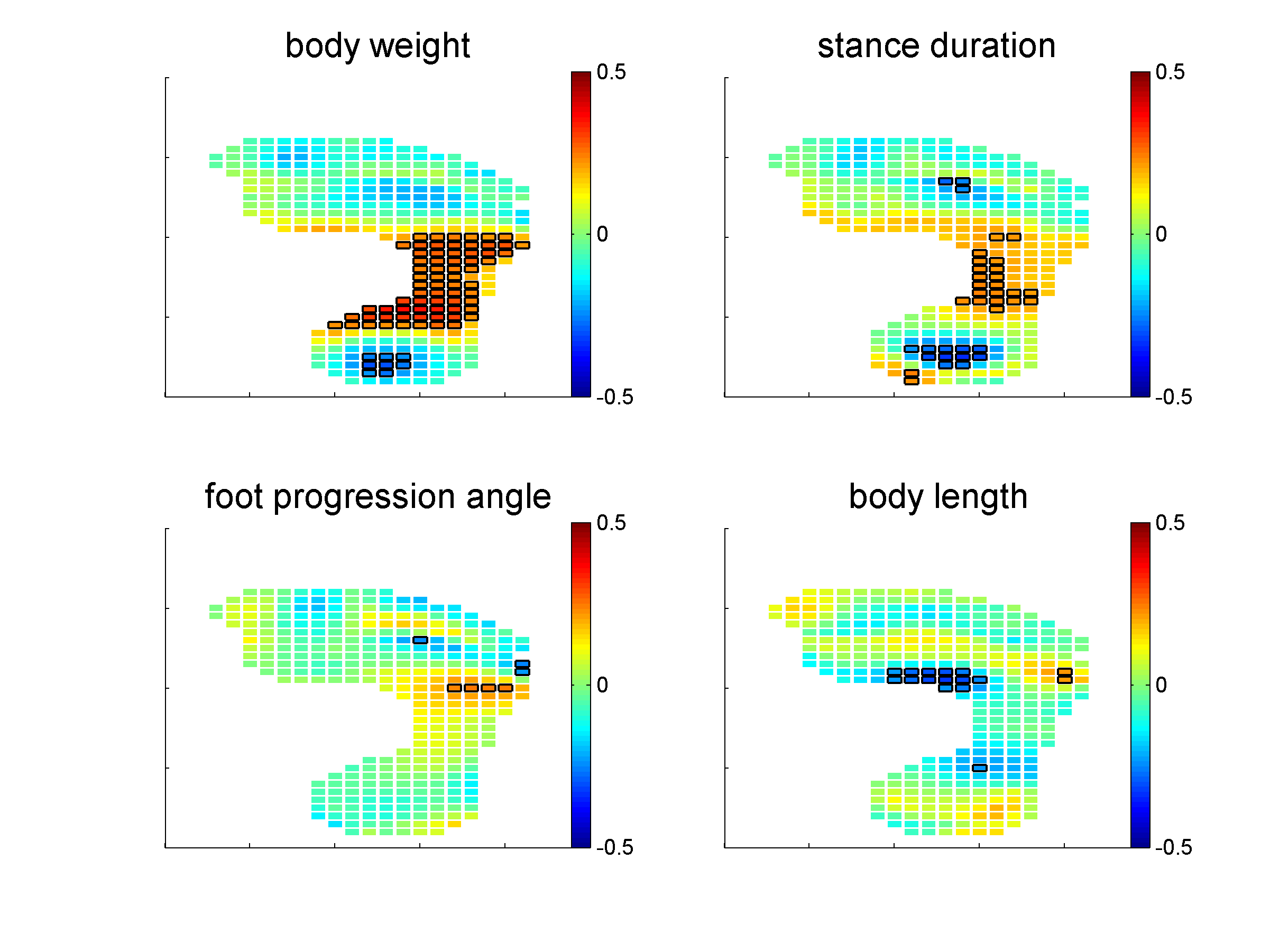 Correlation coefficient between mean pressure for each pixel and body weight (upper left panel), stance duration (upper right panel), foot progression angle (lower left panel), and body length (lower right panel). Pixels with a black border have a correlation coefficient larger than 0.22 (5% explained variance).