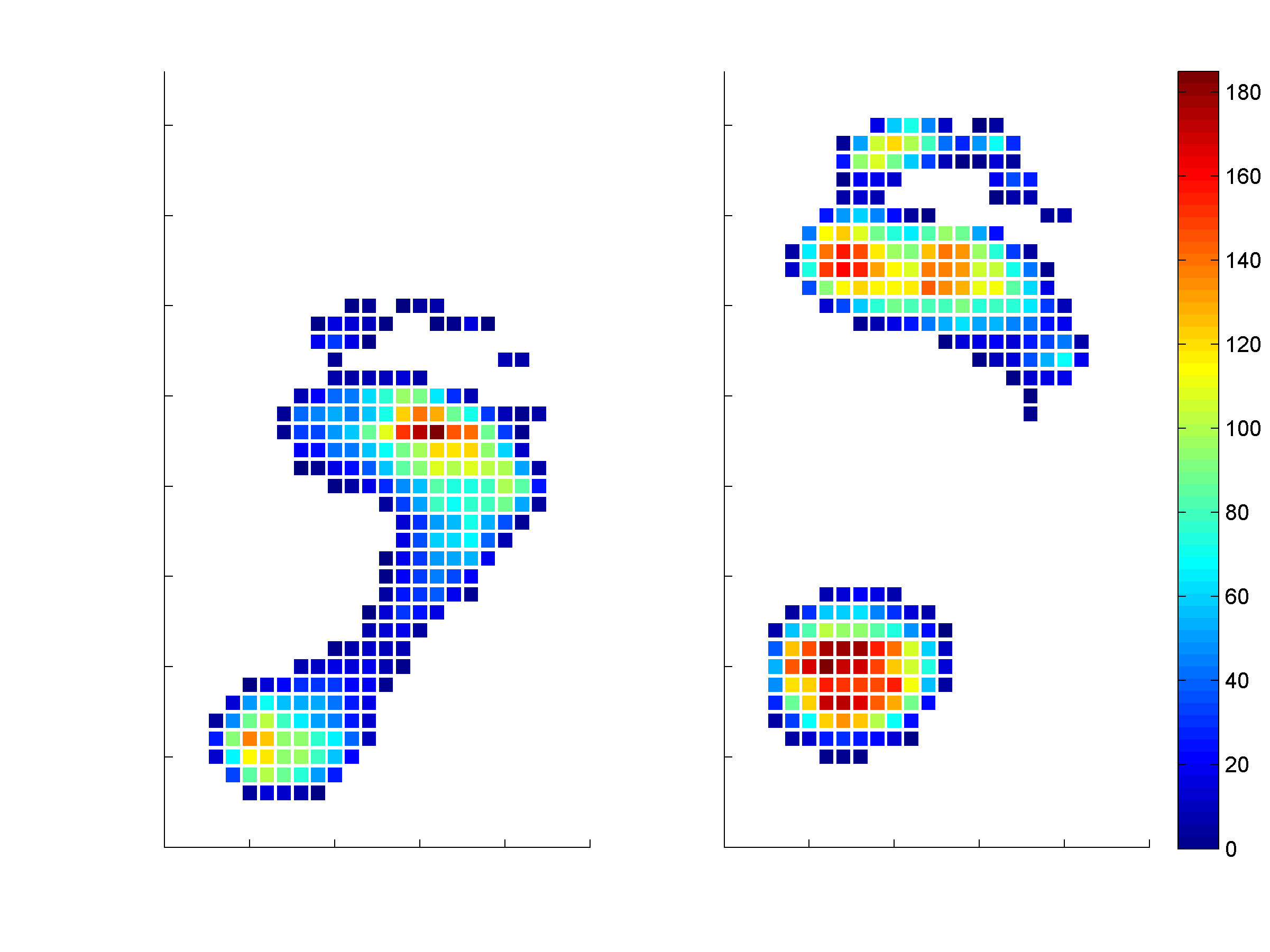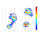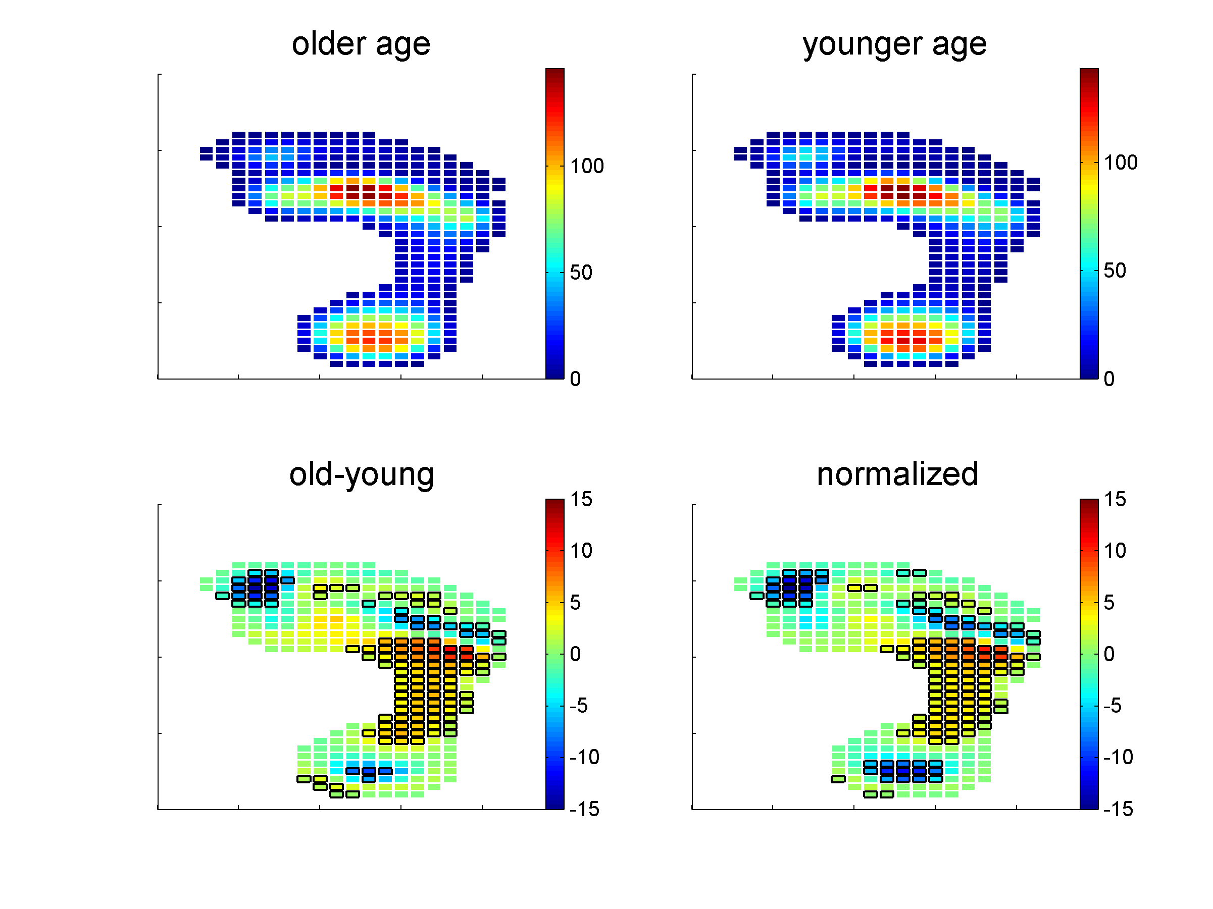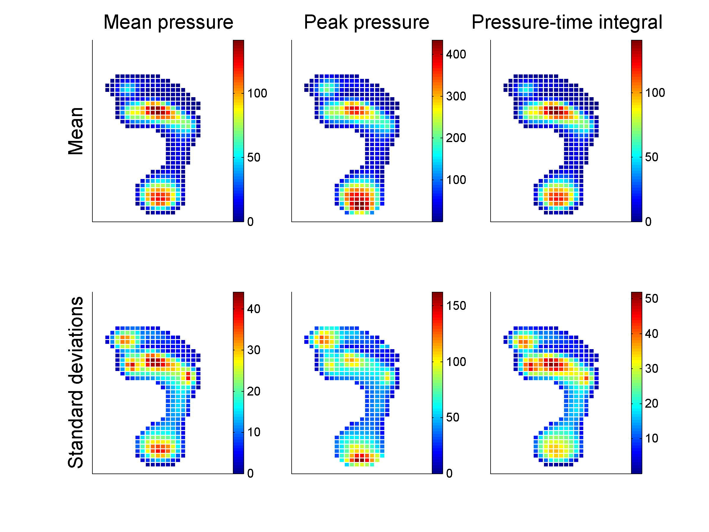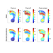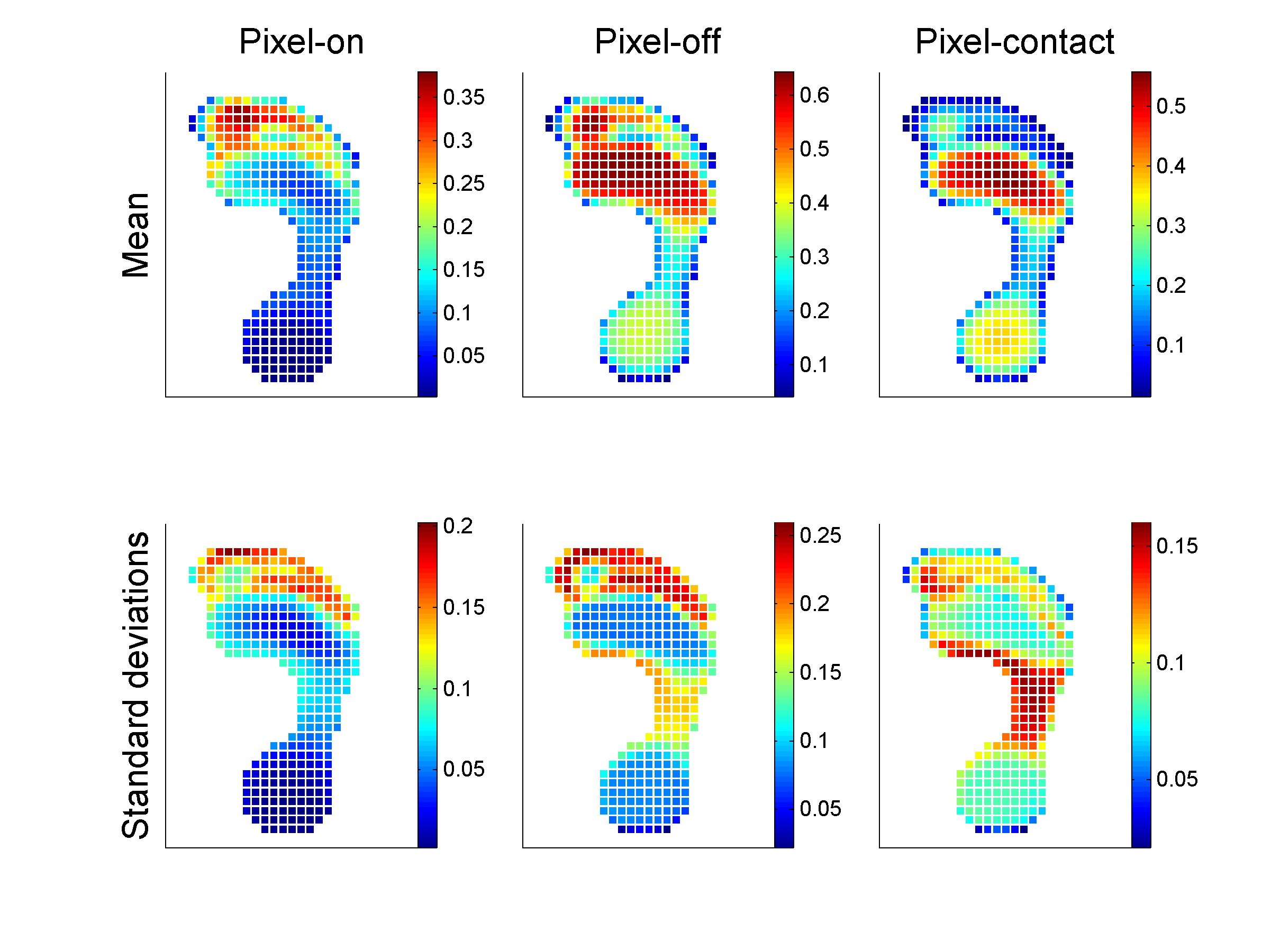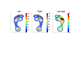 Correlation coefficient between mean pressure for each pixel and body weight (upper left panel), stance duration (upper right panel), foot progression angle (lower left panel), and body length (lower right panel). Pixels with a black border have a correlation coefficient larger than 0.22 (5% explained variance).