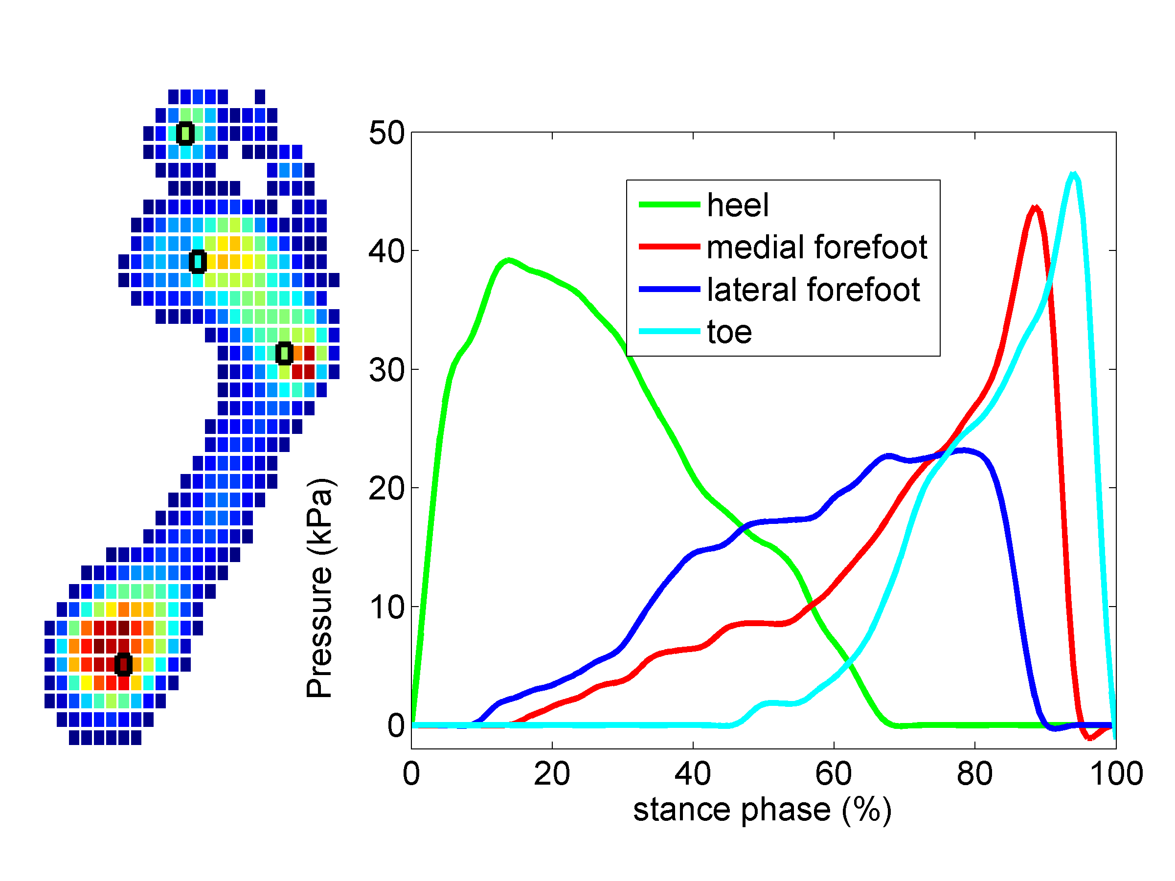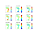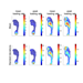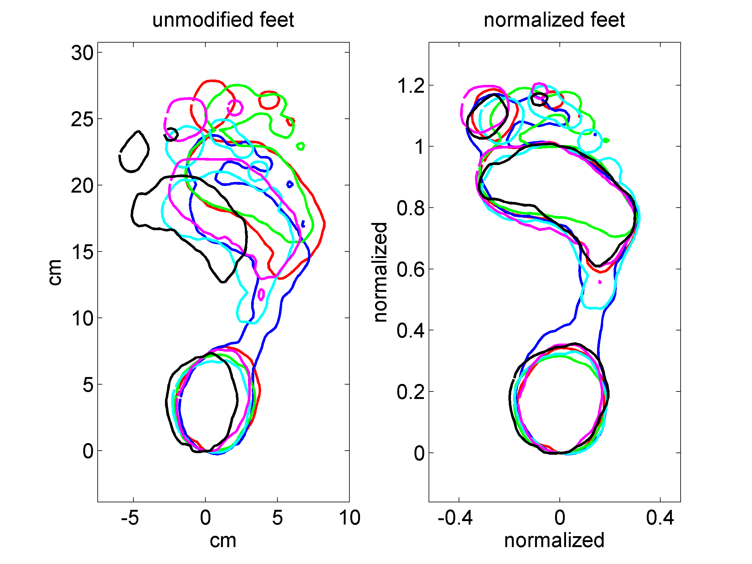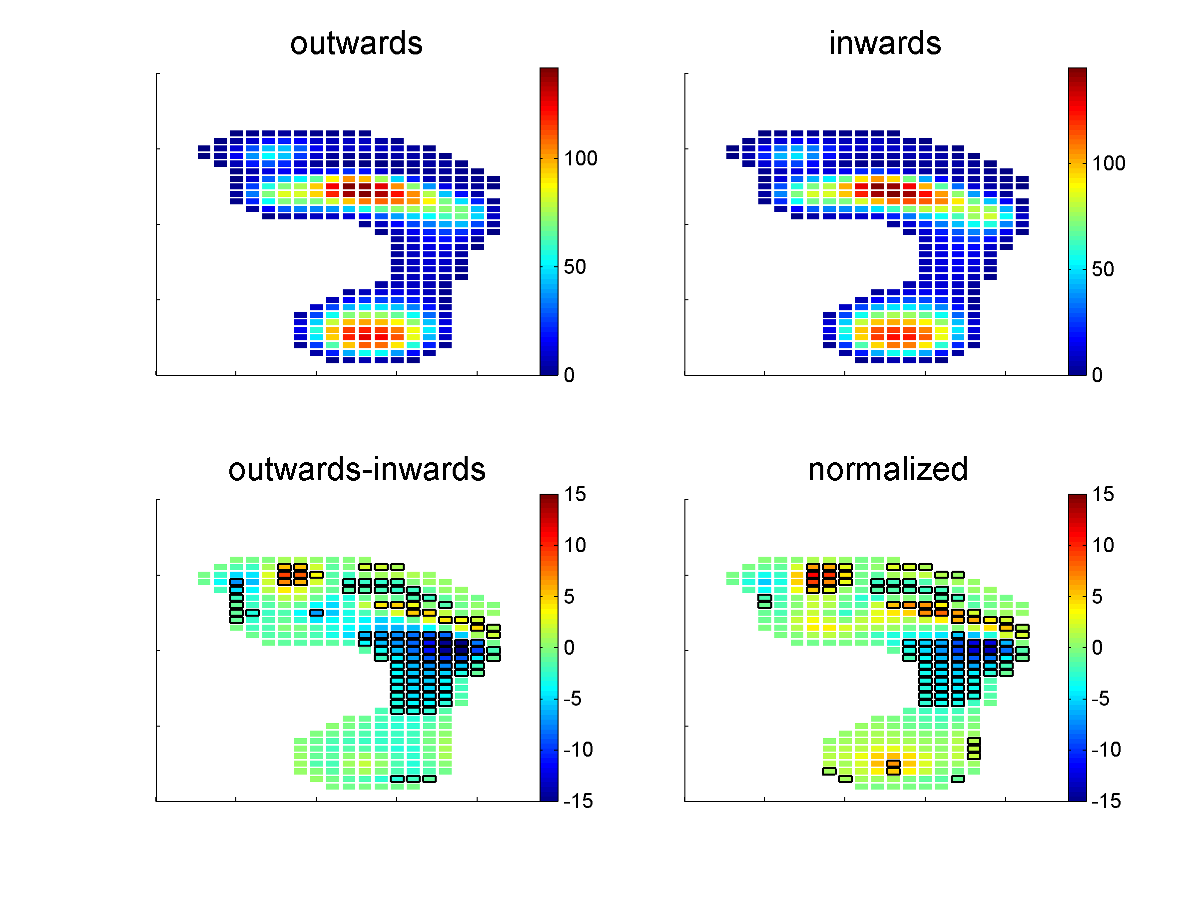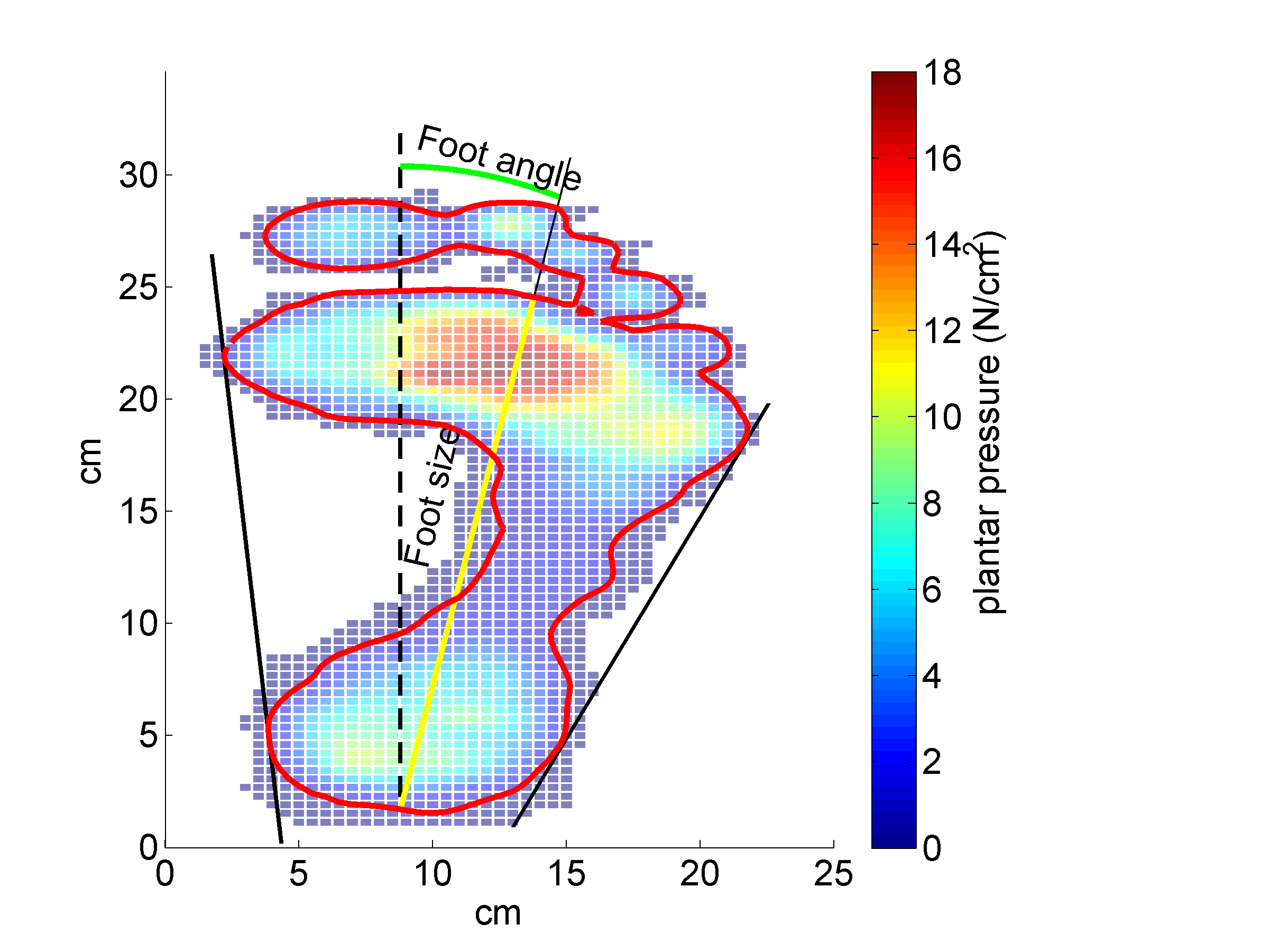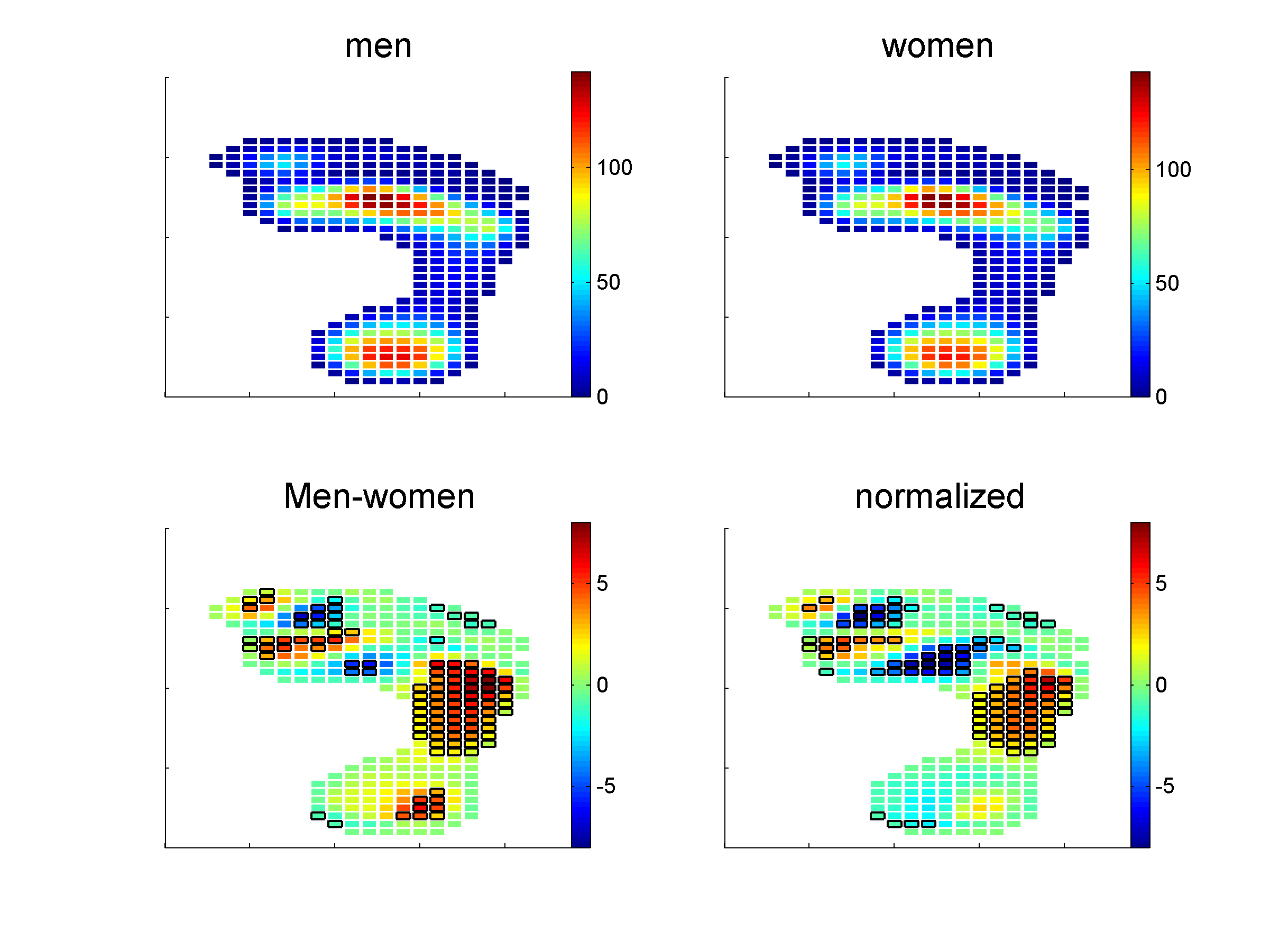 Correlation coefficient between mean pressure for each pixel and body weight (upper left panel), stance duration (upper right panel), foot progression angle (lower left panel), and body length (lower right panel). Pixels with a black border have a correlation coefficient larger than 0.22 (5% explained variance).