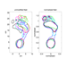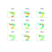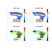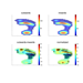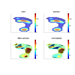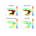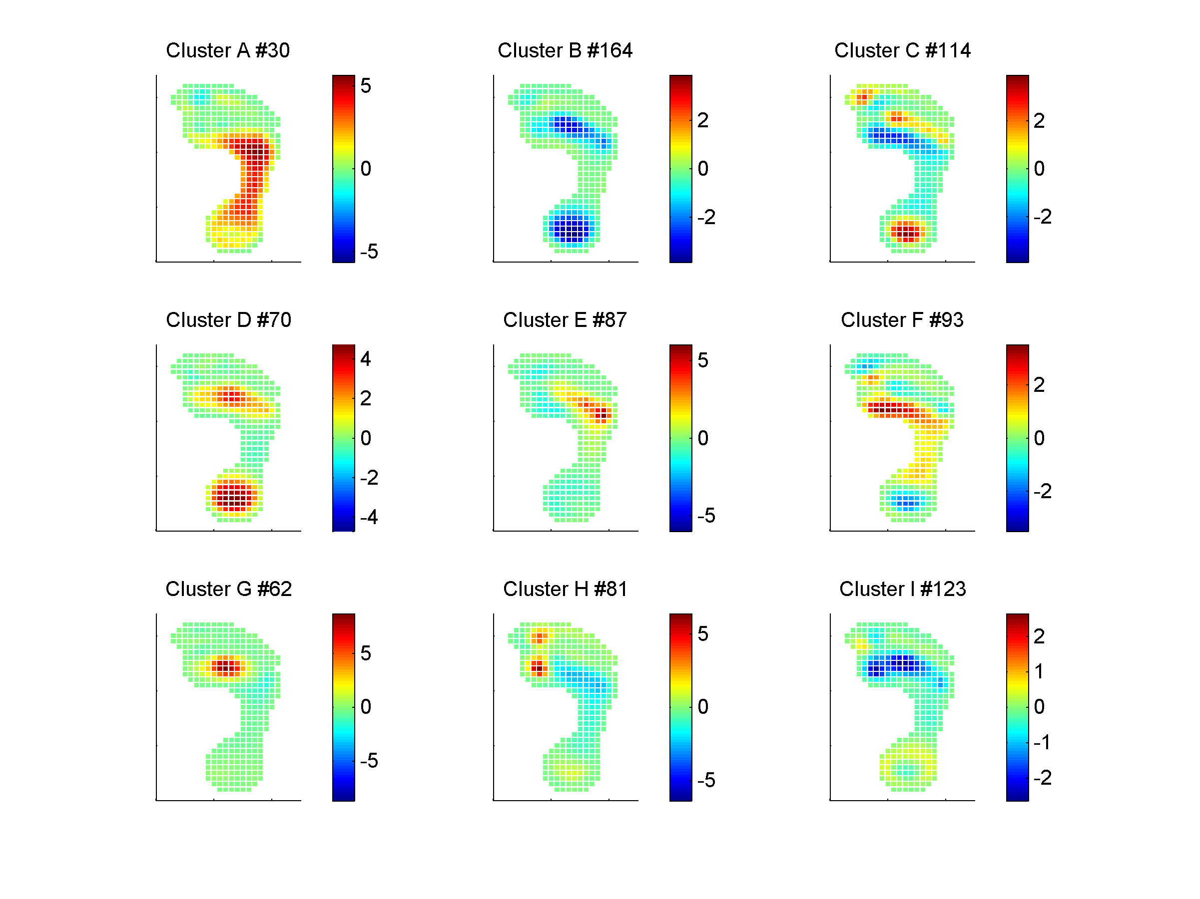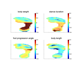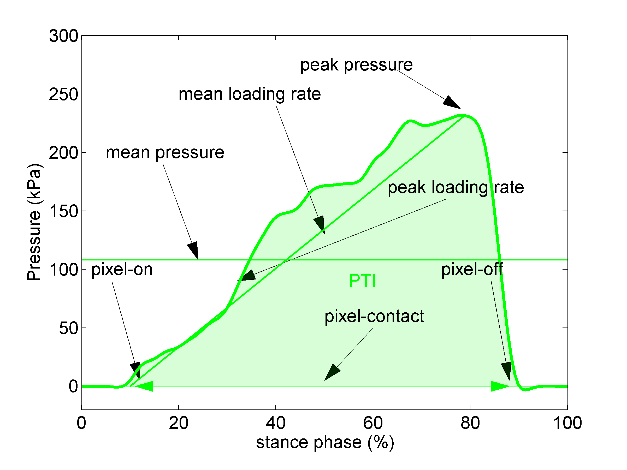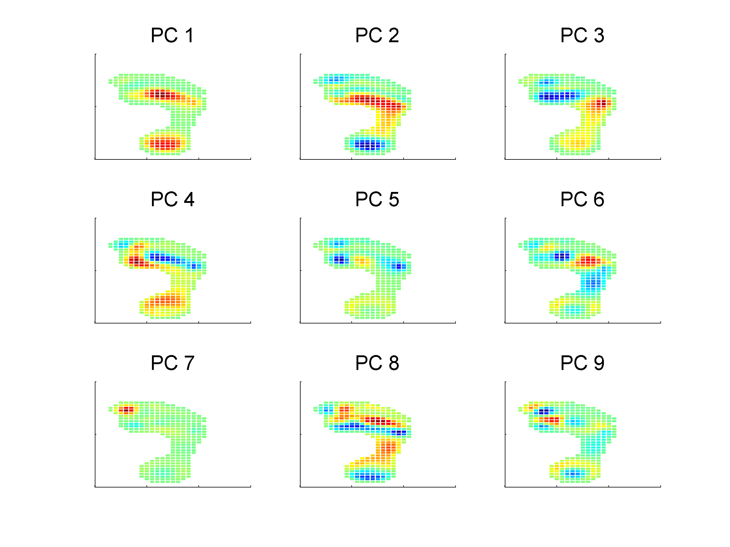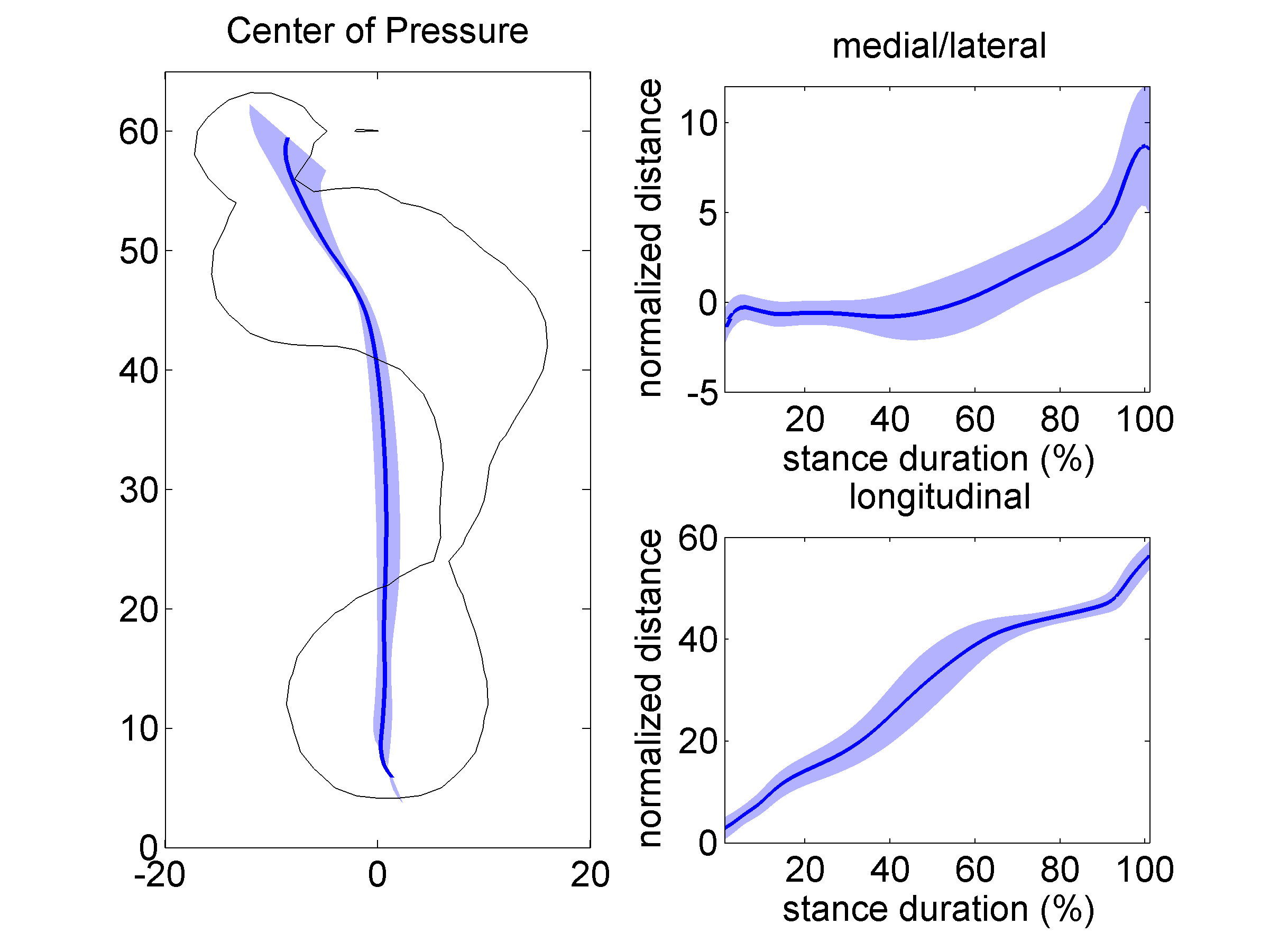 Correlation coefficient between mean pressure for each pixel and body weight (upper left panel), stance duration (upper right panel), foot progression angle (lower left panel), and body length (lower right panel). Pixels with a black border have a correlation coefficient larger than 0.22 (5% explained variance).