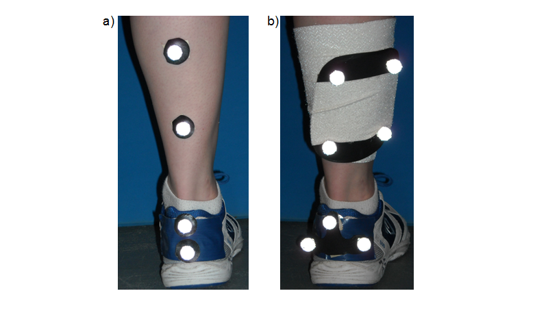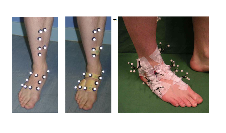 Marker arrangement using: a) skin mounted markers; b) markers mounted on plates; and c) markers on bone pins inserted into nine bones. Reprinted with permission from Nester, C., R.K. Jones, A. Liu, D. Howard, A. Lunberg, A. Arndt, P. Lundgren, A. Stacoff, P. Wolf. (2007). Foot kinematics during walking measured using bone and surface mounted markers. Journal of Biomechanics 40:3412-3423.