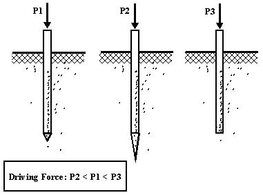 A supporting pile needs to be driven into soft ground, deep enough to provide support for some construction above the ground. Three cases are shown in the figure. If the pile is blunt, it needs a large driving force to put it into the ground, but it is subsequently very stable in use. A very sharp pile is easy to drive into the ground (low force, P2), but any construction built on such a pile will sink into the ground easily, and is therefore unstable.