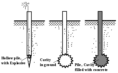 Here, the sharp point of the hollow pile is used to drive it deep into the ground, and the explosive is then used to generate a blunt cavity, which is unified with the pile by pouring in concrete.