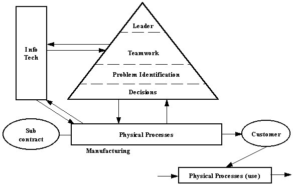 Any manufacturing system works through the integration of four components: physical processes (e.g. machines, tools, hard assets etc.), decision structures (mechanisms and criteria for decision making, e.g. scheduling, forecasting models, inventory control policies etc.), information technology (data/information stored about all aspects of the system and the supporting technology to maintain the data), and humans. This integration is captured in the following figure: