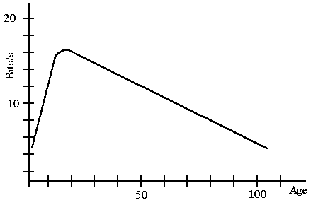 Another interesting observation about humans: our brain's capability to process data increases till the age of approximately 20 years, and then decreases (!) as shown below: