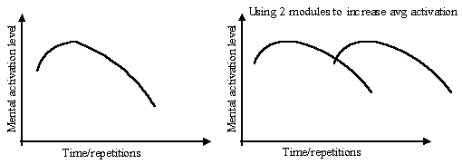 Further, mental activation should be kept high in order to avoid errors during the performance of tasks. The figure below shows typical level of mental activation with increasing number of repetitions of the same task. One possible method to maintain a high average mental activation state is to compose the manufacturing task into modules, and allow the workers to rotate between modules periodically, as shown in the second figure.