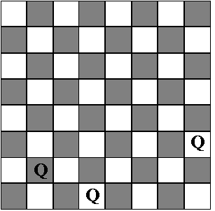 Note: one can, of course be smarter and observe the following: each row must contain exactly one queen; so we may just assign the first queen row 1, the second, row 2, and so on. Thus the search can be reduced greatly. Figure 2 shows a typical stage of this search.
