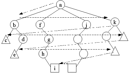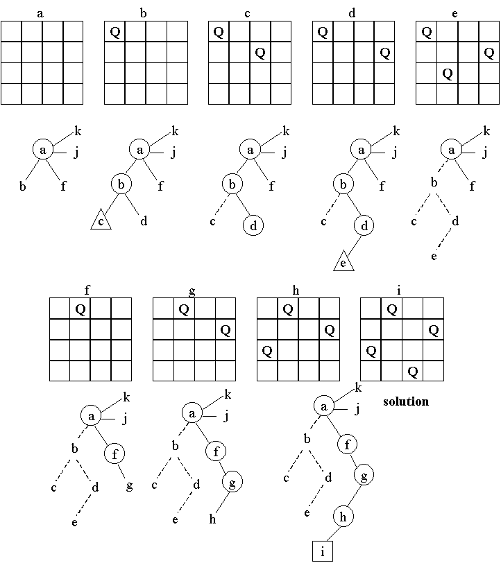Figure 3 shows the depth-first search tree for a 4-queens problem. Circled nodes are CLOSED, and nodes in a triangle are dead-ends. The successor function generates, in the i-th level, the board positions available for locating the queen in the i-th row.
