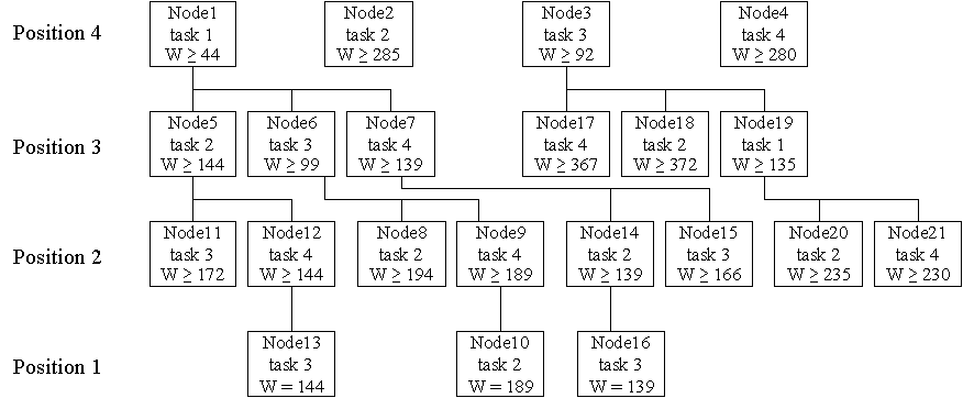 In setting up the branch and bound search, one has to select the heuristic function carefully. In this case, it is convenient to set up a function that yields a bound on the cost if we set up a backward-planning search. That is, the first level of nodes from START indicate possible choices of the last task we shall do. This gives us a means to compute a lower bound on the total tardiness cost. The algorithm is as follows: