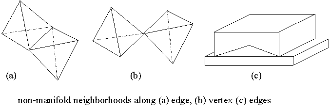 Returning to manifolds (in particular, 2-manifolds), you think of a well behaved solid as a closed point set for which every point on the boundary has a neighborhood that is topologically similar to an open disk. There are some solid objects that do not meet this criterion -- these objects often cause trouble to CAD systems. Examples of some of these non-manifold (polyhedral) objects are shown in the figure below.