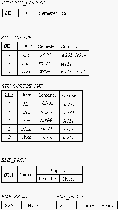 Note: If the composite attribute is single-valued, then we may just use the components of the attribute in the same schema. For example, EMPLOYEE( SSN, NAME(FName, MInit, LName) ), where NAME is a single valued composite attribute, may be written in 1NF as: EMPLOYEE( SSN, FName, MInit, LName).]