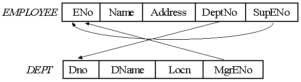 A referential integrity constraint can be displayed in a relational database schema as a directed arc from the referencing (foreign) key to the referenced (primary) key. Examples are shown in the figure below: