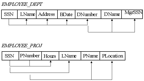 ( b) Insertion anomalies. When we enter the record for a new employee, we must specify ALL data fields for his department correctly. For example, if a new employee joins Dept 5, then we must ensure that the data entered for Dept 5 in the new record is consistent with the data for Dept 5 in all earlier records of other employees of Dept 5.