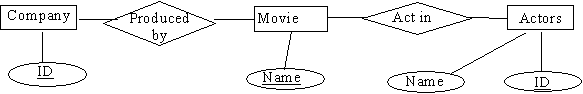 Q1. The following is a partial ER diagram for movies. The following information is known: Each movie is produced by one company, and has zero or more actors. Each actor has acted in one or more movies. Each company has produced one or more movies. Based on this, mark all the cardinality ratios, and all the participation constraints.