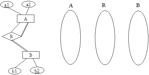 Q2. In the following ER diagram, the database currently has 3 unique entities of Entity type A, and 3 unique entities of Entity type B. Complete the picture of the entity sets such that your picture is consistent with the constraints given: