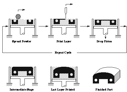 In this method each layer begins with a thin distribution of powder spread over the surface of a powder bed. Using a technology similar to ink-jet printing, a binder material selectively joins particles where the object is to be formed. A piston that supports the powder bed and the part-in-progress lowers so that the next powder layer can be spread and selectively joined. This layer-by-layer process repeats until the part is completed. Following a heat treatment, unbound powder is removed, leaving the fabricated part.