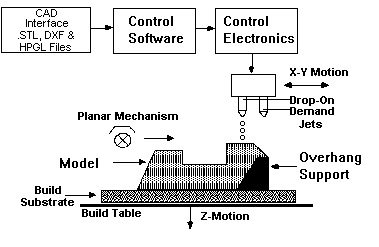 Another company using a similar idea, but different technique is Sanders Inc. They use a variation of the ink-jet printers to deposit thermoplastics or wax, layer by layer, to create the solid. The schematic [source: www.sanders-prototype.com]