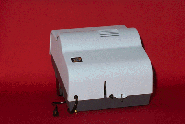 The machine looks like a box with an enclosed pen plotter. The pen of the plotter lays down heated plastic or wax (instead of ink), building the model up in successive layers.