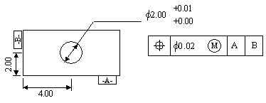 Let the actual size of the hole be 2.00+t, (t < 0.01). Then the center of the hole may be located at any point in a circle of diameter (0.02 + t), and still the hole will fit the gauge. Hence the actual positional tolerance on the center of the hole = (0.02+ t); in the figure, the pink circle shows an acceptable hole that will fit through the gauge, although the center of the pink hole is outside the gray tolerance zone.