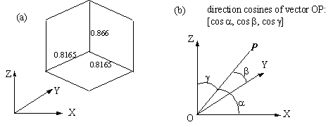 Q2 A unit cube is rotated and tilted and its orthogonal projection is drawn in full scale on the XZ plane. In the projection, the lengths of the three orthogonal edges are 0.8165, 0.8165 and 0.866, as shown in the figure (a) below. Find the direction cosines (see figure (b)) of each these three edges in the global coordinate frame.