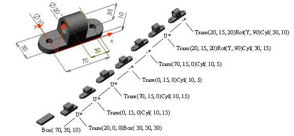 Q4 Using CSG primitives Block and Cylinder, show a CSG tree for the part below [note: all holes are concentric to the semi-circular ends].