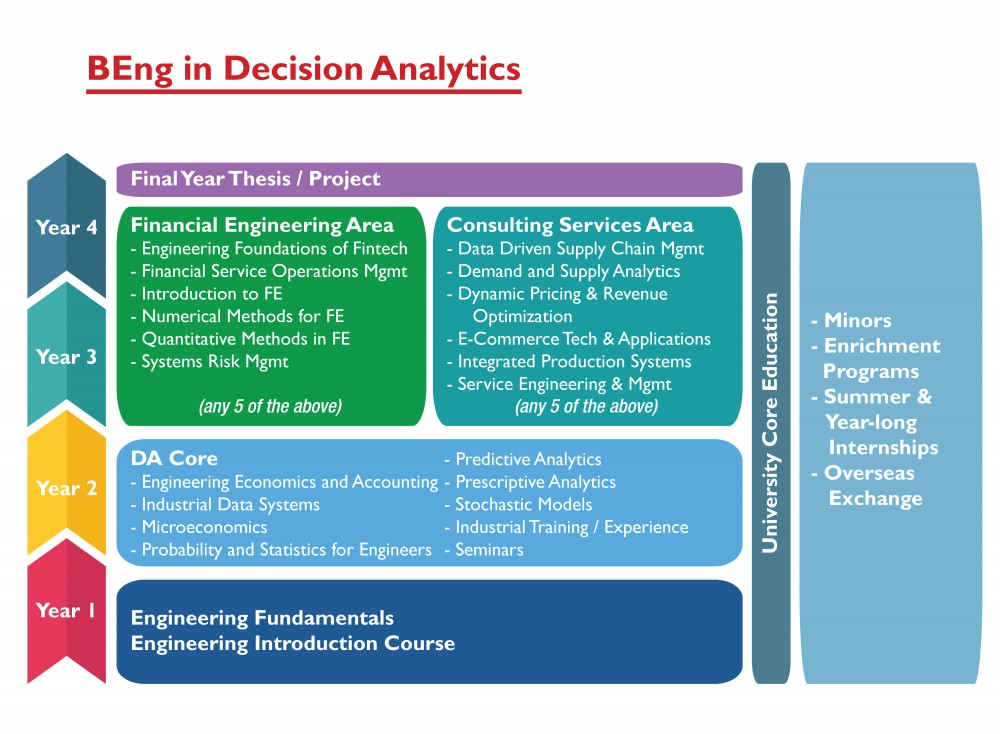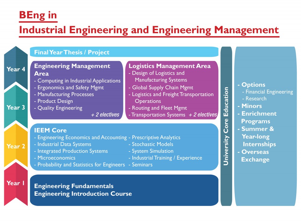 Our existing UG programs (IEEM and LME) will be combined into a single major called Industrial Engineering & Engineering Management. This program will share many of the core courses with Decision Analytics and students will benefit from courses that are more in line with the modern economy. Students will have the option to specialize in one of two areas: logistics management or engineering management. Graduates from this program will gain professional expertise for working in the logistics or manufacturing sectors, especially focusing on jobs related to scheduling, logistics, systems design, operations planning, quality management and performance analysis.